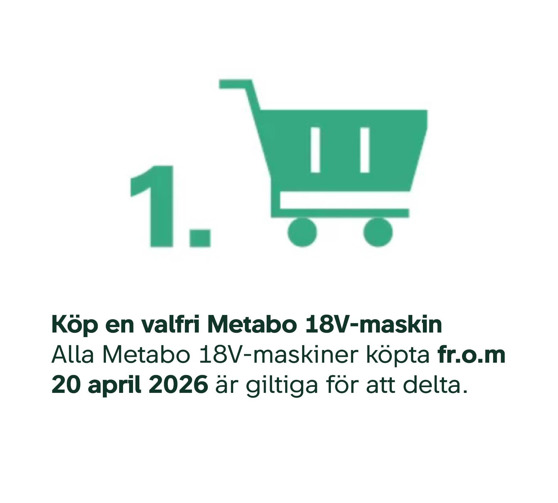 *Från 20 april 2026 till 19 juli 2026 kan du vara med i vår nordiska kampanj och vinna fina priser när du köper ett Metabo 18V batteridrivet elverktyg. För att delta i tävlingen med dessa attraktiva priser behöver du köpa en Metabo 18V batteridriven maskin under tävlingsperioden och registrera dina kontaktuppgifter samt ditt inköpskvitto/faktura senast innan deltagandeperioden löpt ut, samt besvara en tävlingsfråga. De fullständiga deltagarvillkoren samt information om priser och personuppgifter finns att läsa via länkarna nedan på denna sida. Reservation för att fel, samt ändringar av priser kan ske och tävlingen kan komma att ändras eller avslutas i förtid.